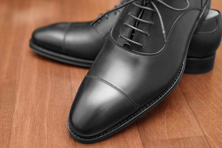 アッパーには黒染めした姫路レザーを採用。内羽根の黒は冠婚葬祭などフォーマルなシーンにも使われることが多く、どのシチュエーションにもマッチする一足。