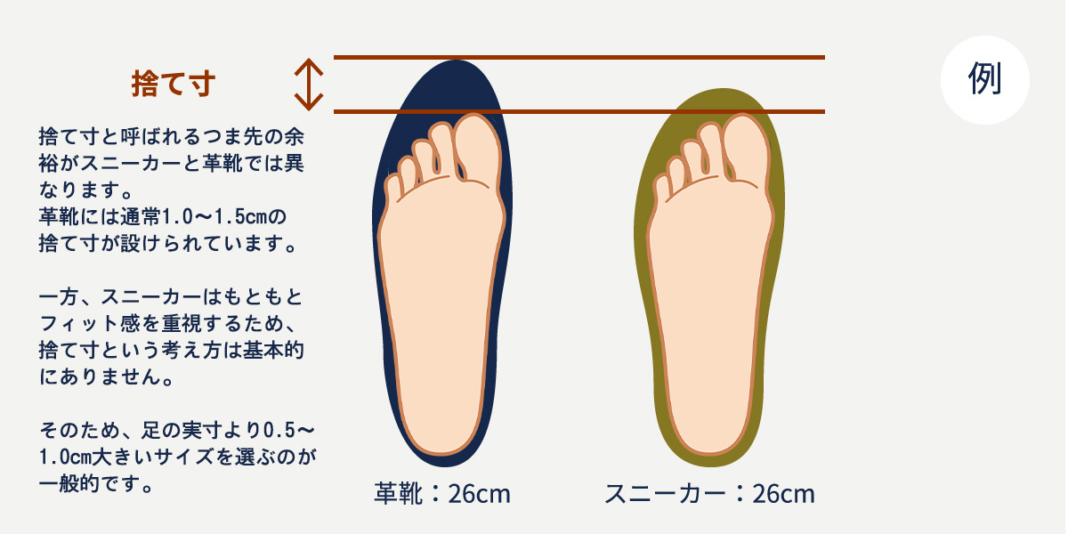 また、捨て寸と呼ばれるつま先の余裕がスニーカーと革靴では異なります。