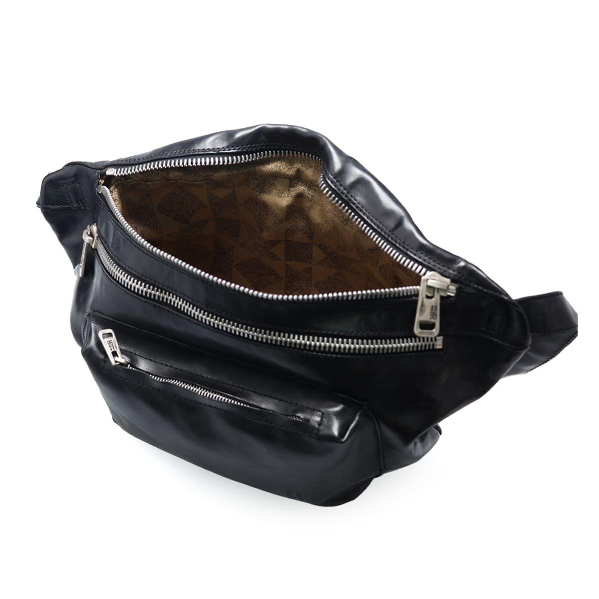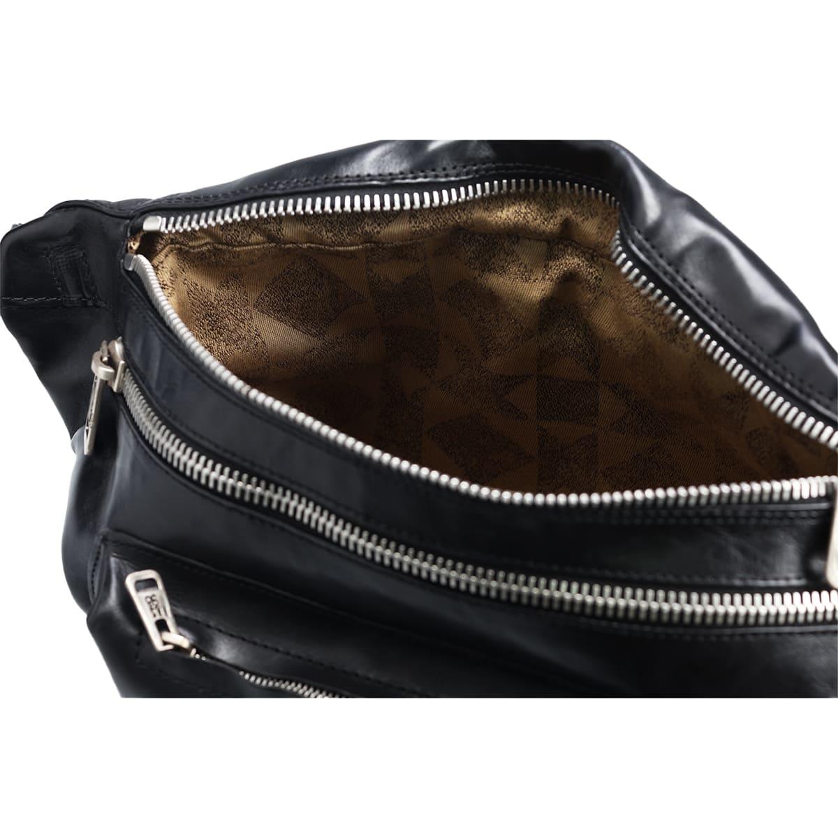 正面にヴィンテージシルバーのファスナーがあり、デザインのアクセントとして存在感を放ちながら、使い勝手の良さも兼ね備えています。