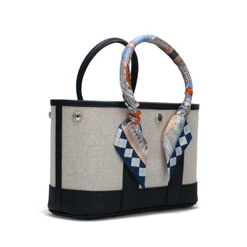 ミニハンドバッグ Mini Hand Bag 上品さと実用性を兼ね備えたコンパクトトート。 ※スカーフの色・柄についてはご指定いただけません。ご了承ください。 Detail 上質な帆布と本革を組み合わせた、スタイリッシュで実用的なミニトートバッグ。 ハンドルにはアクセントとなるスカーフが巻かれており、シンプルなデザインに華やかさを添えます。 小ぶりなサイズ感ながらもガバっと開いて荷物を入れやすく、デイリーからちょっとしたお出かけまで活躍。 サイドのスナップボタンを留めたり外したりすることで、シルエットが変わり、気分に合わせてかわいい表情を楽しめます。 Color Variation ブラック エトゥープ グリーン グレージュ ラクダ
