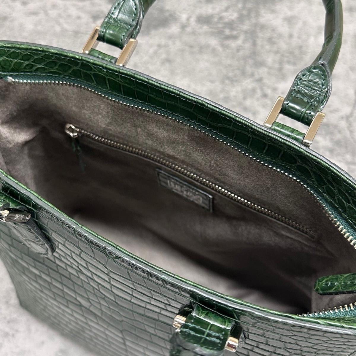 深みのあるグリーンとクロコダイル特有の光沢・質感が、持つだけで上質な存在感を演出。