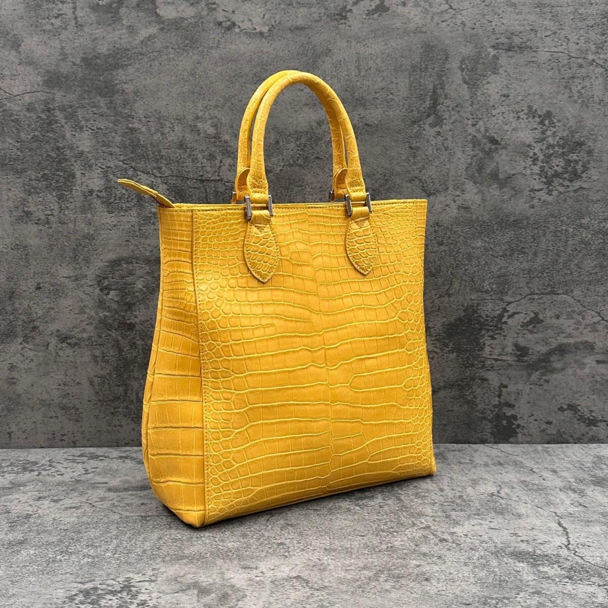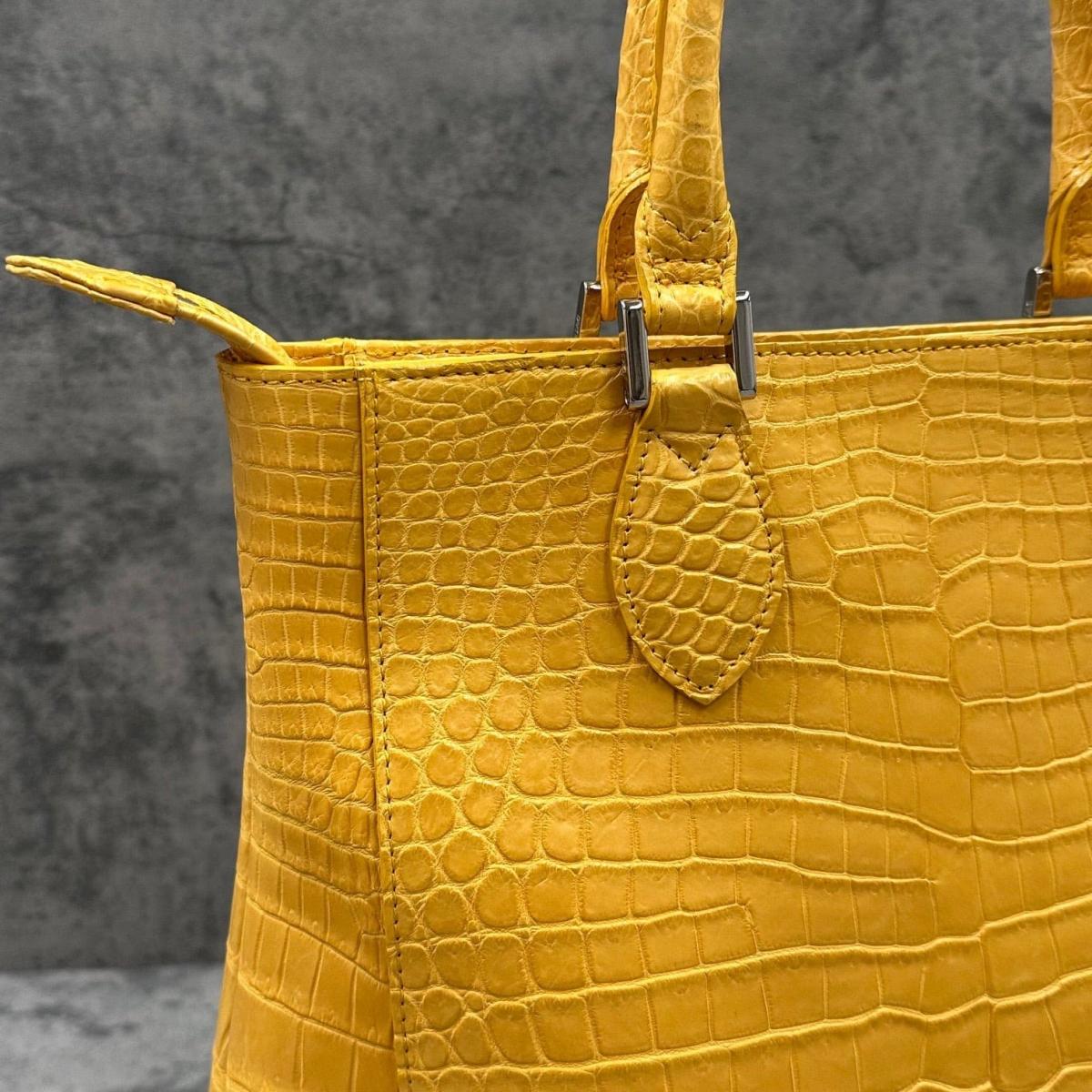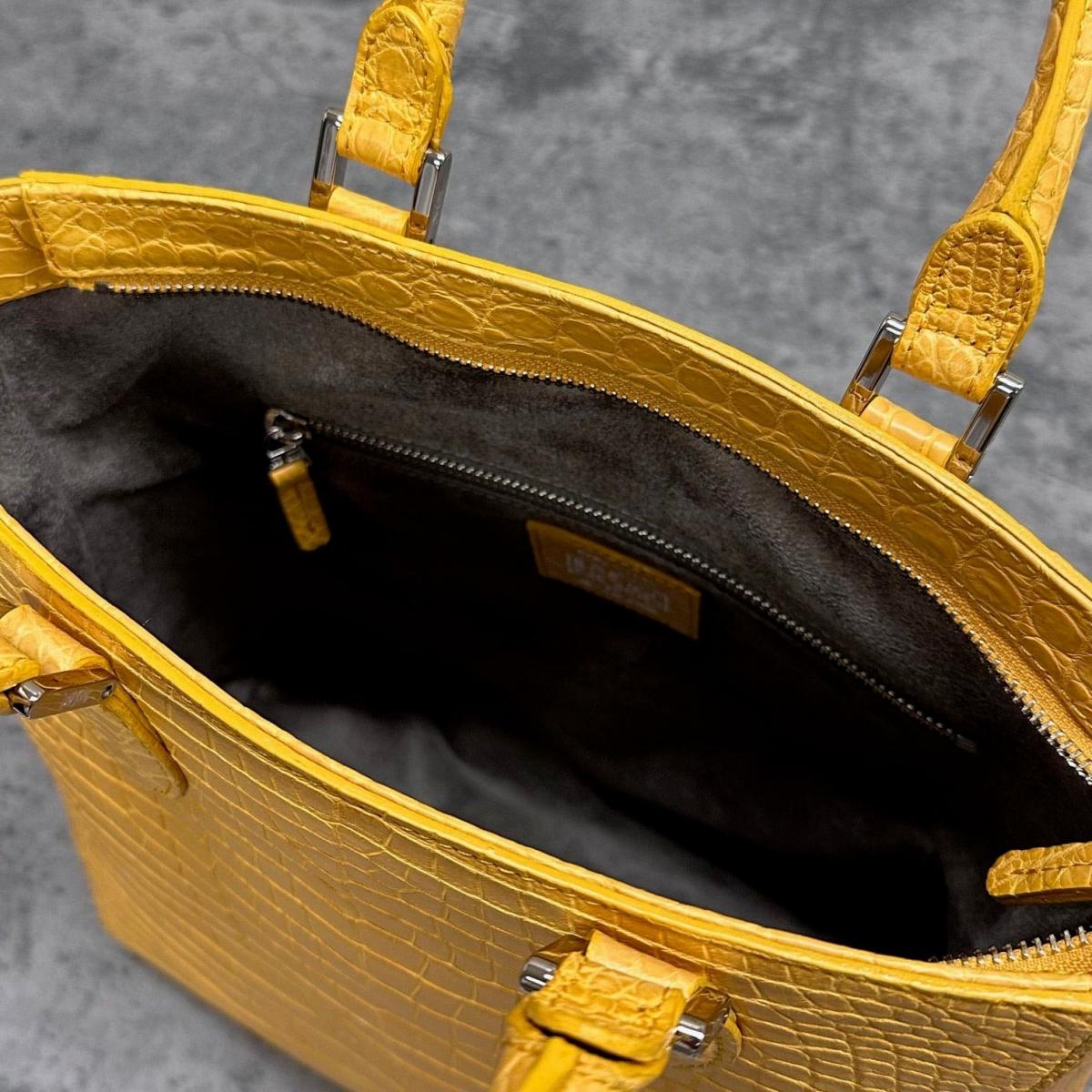 鮮やかなマスタードカラーとクロコダイル特有の光沢・質感が、持つだけで存在感と上質さを放ちます。