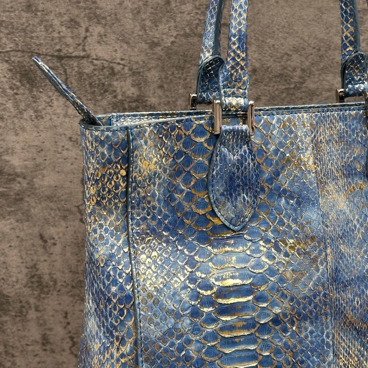パイソンレザー特有の鱗模様と、ゴールドとブルーが織りなす鮮やかで上品な色合いは、光の角度によって表情を変え、見る人の目を惹く美しさです。