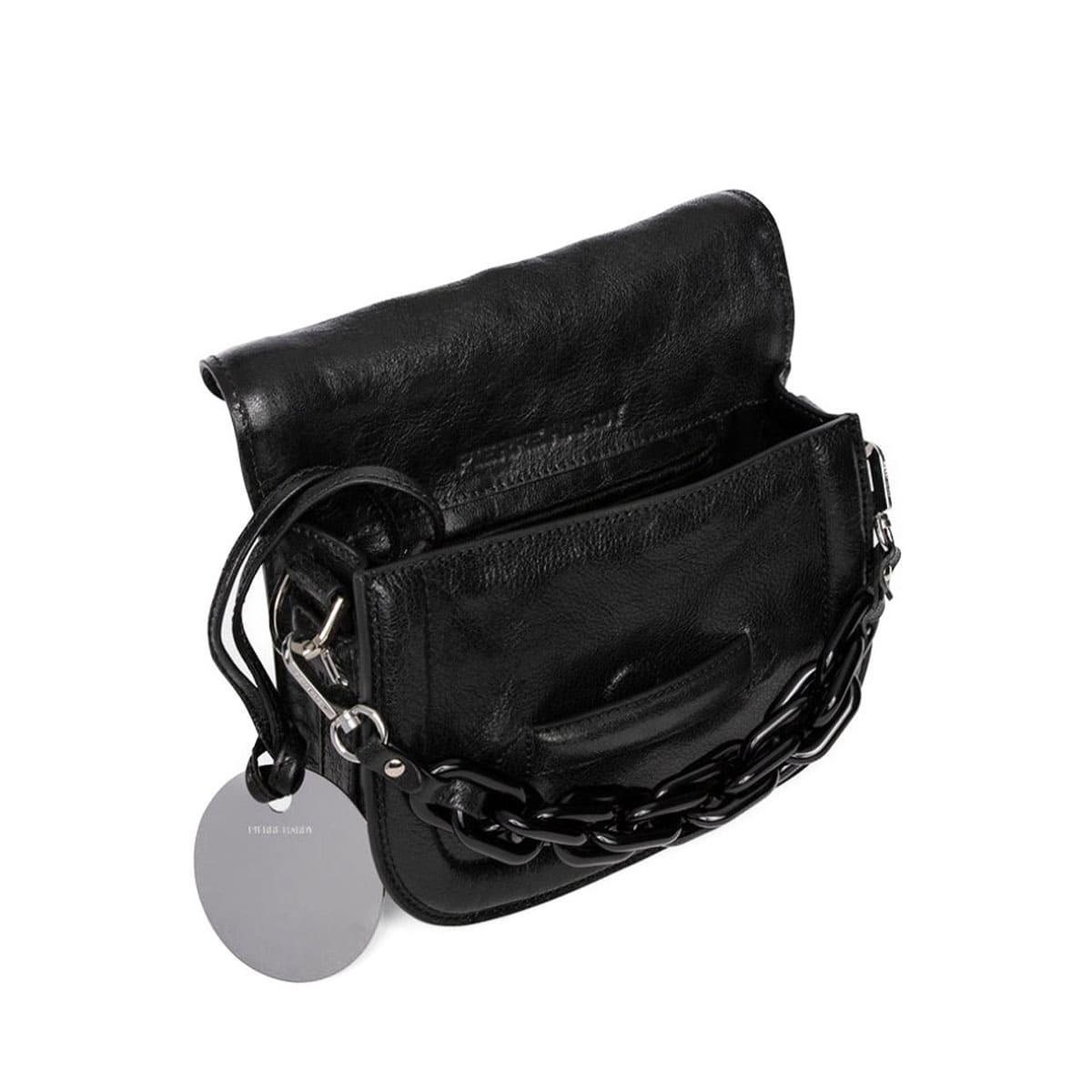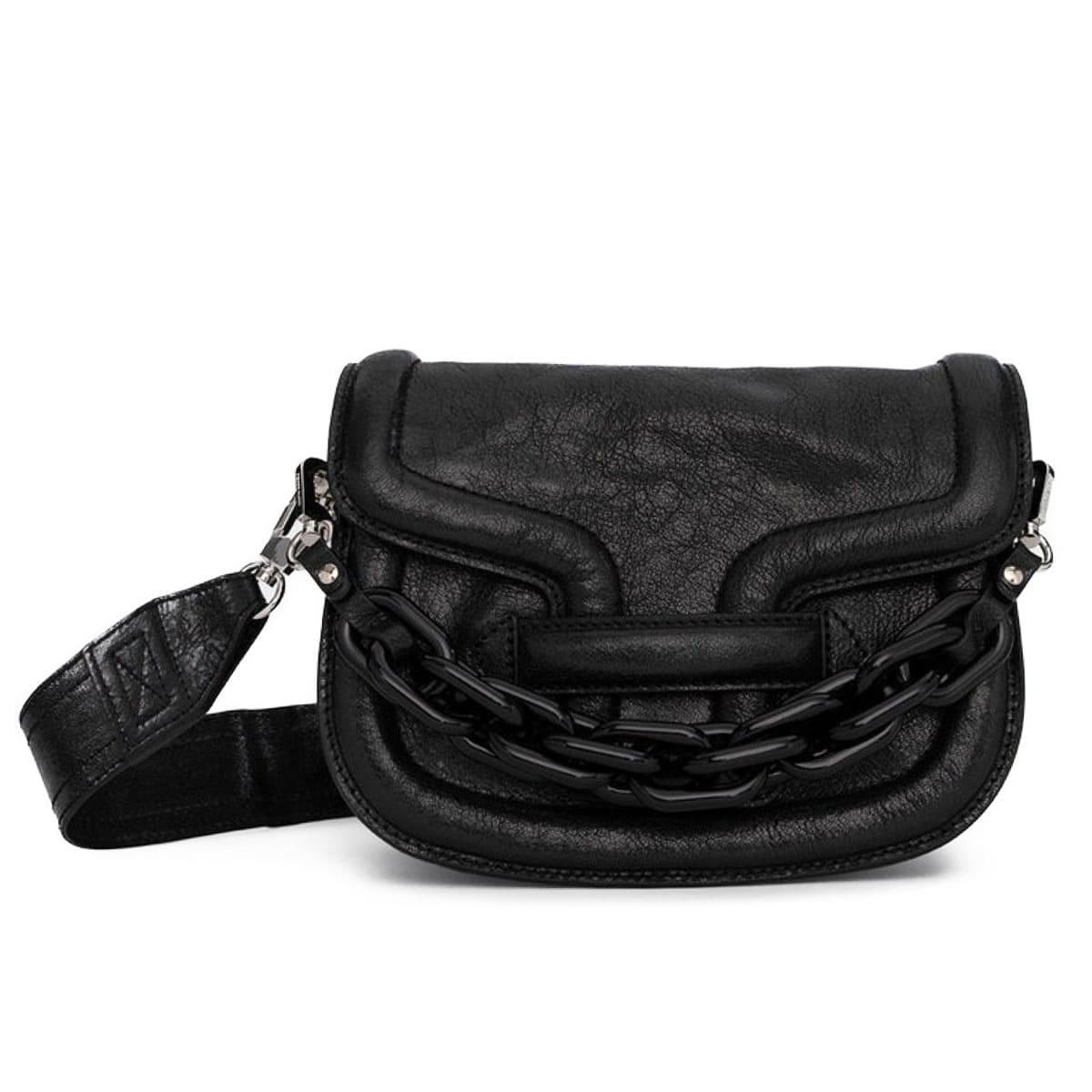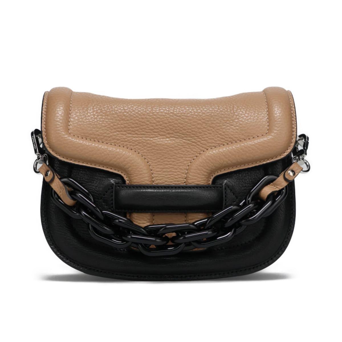 丸みを帯びたフォルムに、太めのレザーストラップとチャンキーなチェーンハンドルを組み合わせたデザインは、上品さとエッジの効いたモード感を兼ね備えています。