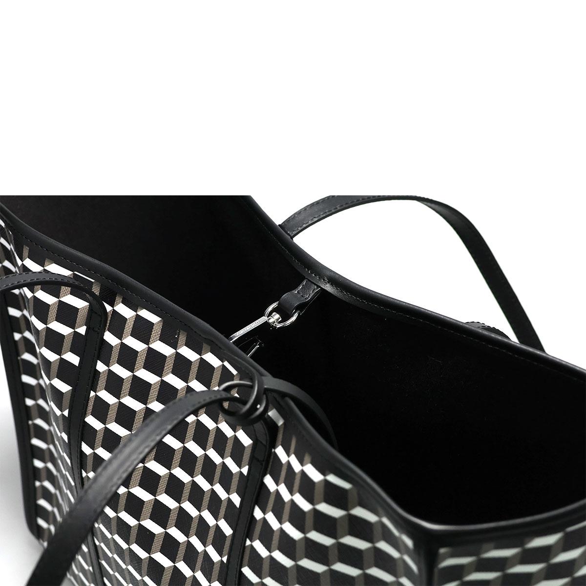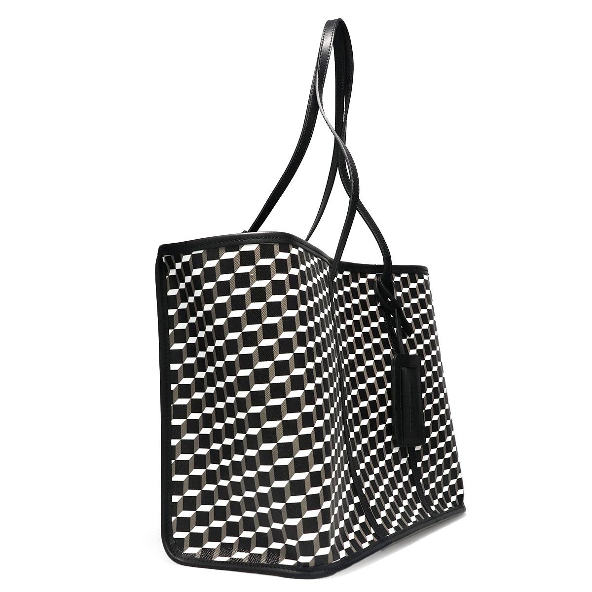 モノトーンで構成された大胆なキューブ柄が、持つだけでコーディネートをモダンに格上げします。