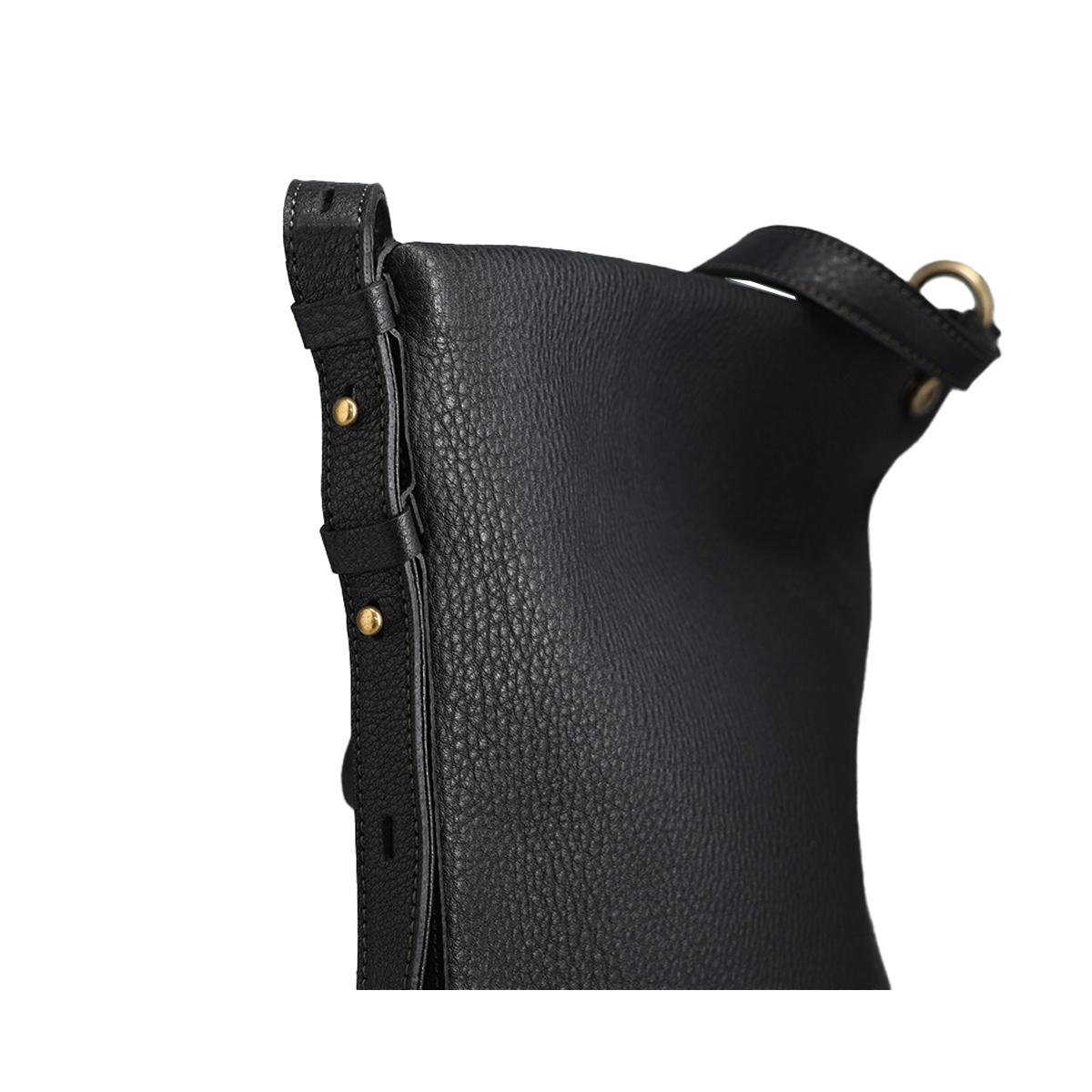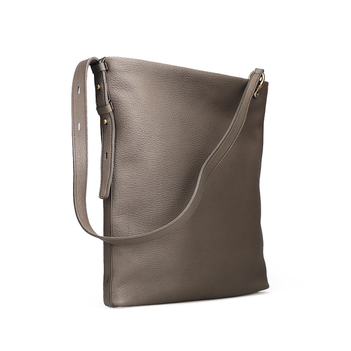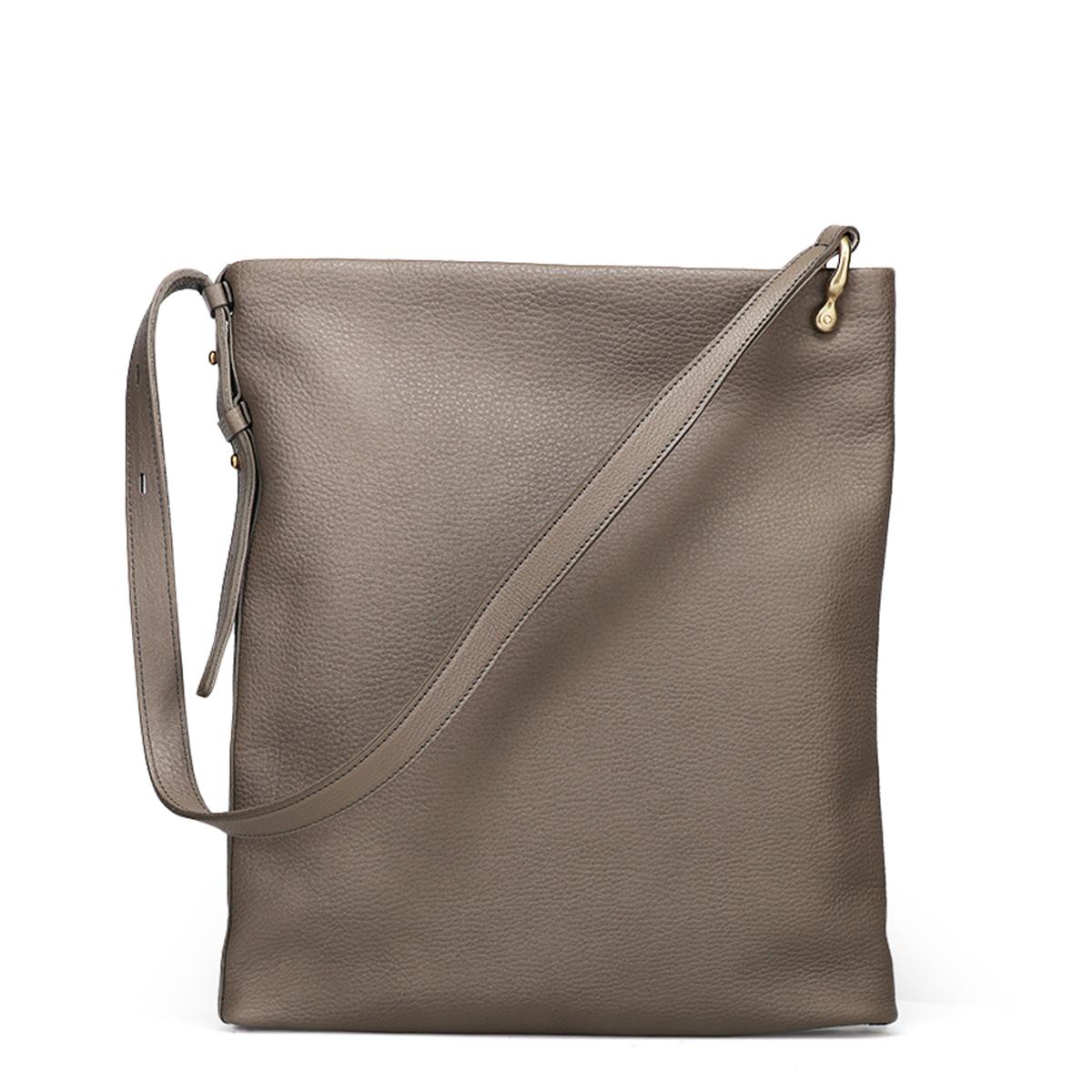 ショルダーバッグミニマル Shoulder Bag Minimal 金具ひとつで変わる表情。洗練を纏うスクエアショルダーバッグ。 Detail ヒートドラム加工を施したソフトシュリンクレザーは、手に吸い付くような柔らかさと奥行きのあるシボ感を実現。 端正なスクエアシルエットにこの自然な質感をまとわせることで、シンプルながらも存在感のあるデザインに仕上げています。 内部にはファスナーポケットとオープンポケットを備え、小物や必需品をスマートに整理可能。 収納力もあり、通勤や休日のお出かけにマルチに活躍します。 サイドに配した真鍮金具でショルダーストラップの長さを調節でき、コーディネートや気分に合わせて持ち方を変えて楽しめます。 Color Variation エトゥープ ブラック