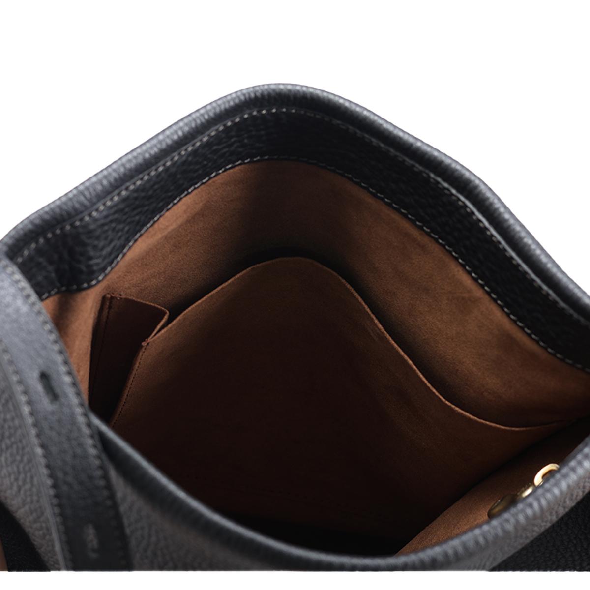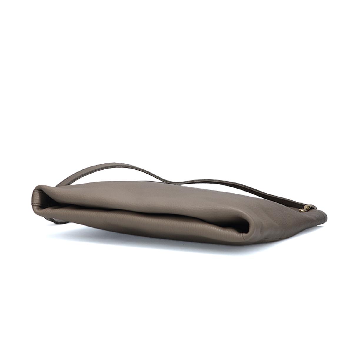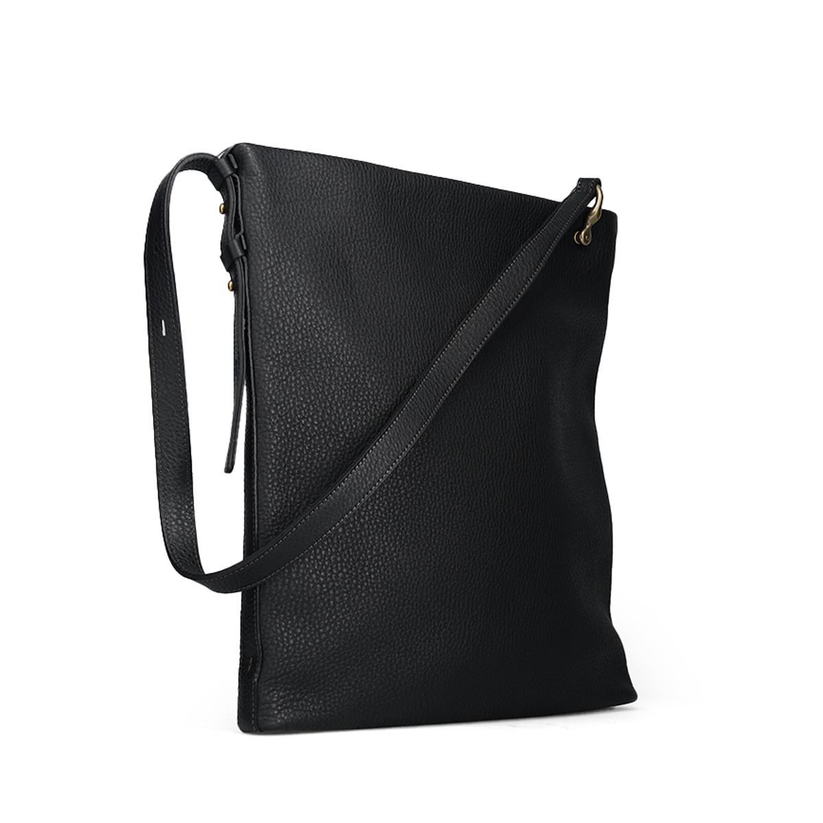 ショルダーバッグミニマル Shoulder Bag Minimal 金具ひとつで変わる表情。洗練を纏うスクエアショルダーバッグ。 Detail ヒートドラム加工を施したソフトシュリンクレザーは、手に吸い付くような柔らかさと奥行きのあるシボ感を実現。 端正なスクエアシルエットにこの自然な質感をまとわせることで、シンプルながらも存在感のあるデザインに仕上げています。 内部にはファスナーポケットとオープンポケットを備え、小物や必需品をスマートに整理可能。 収納力もあり、通勤や休日のお出かけにマルチに活躍します。 サイドに配した真鍮金具でショルダーストラップの長さを調節でき、コーディネートや気分に合わせて持ち方を変えて楽しめます。 Color Variation エトゥープ ブラック