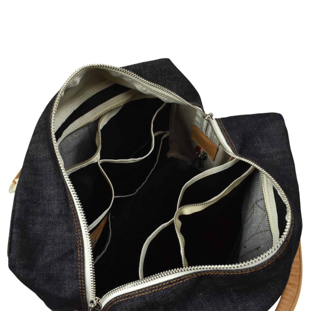 内側には計10個のポケットを備え、荷物を機能的に整理可能。さらに、カスタムキーホルダーカラビナを内側に配置し、鍵などもスマートに収納できます。