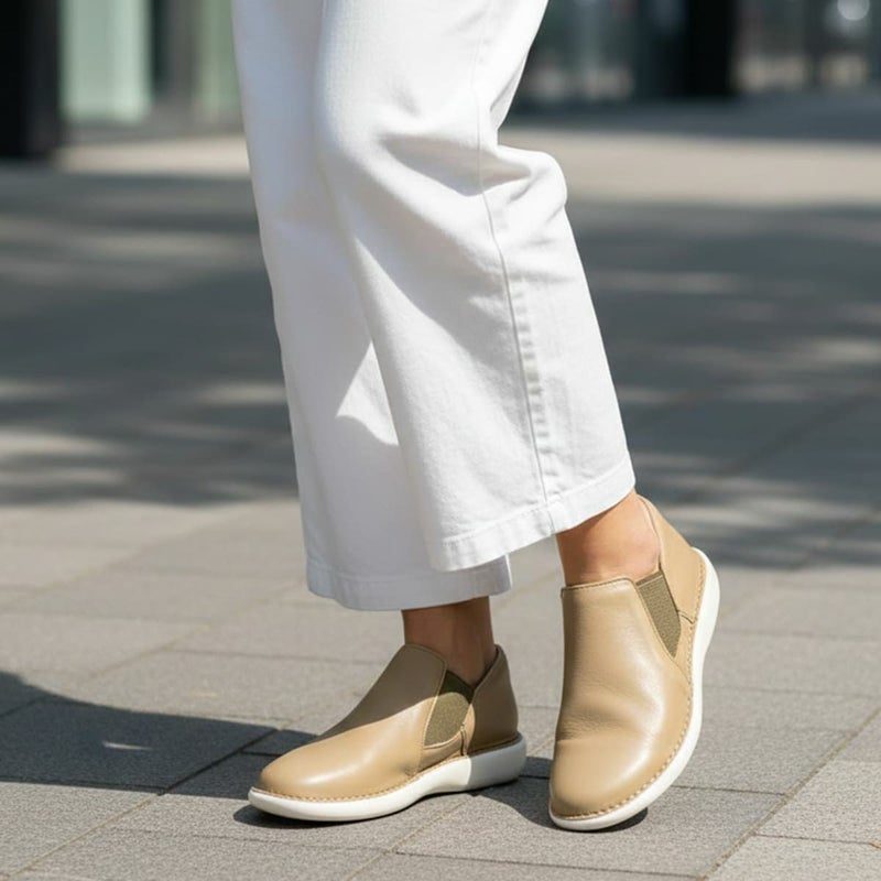 甲部分にはサイドゴアを配し、紐のないデザインながら足入れはスムーズ。忙しい日常でもストレスなく着脱できる一足です。
