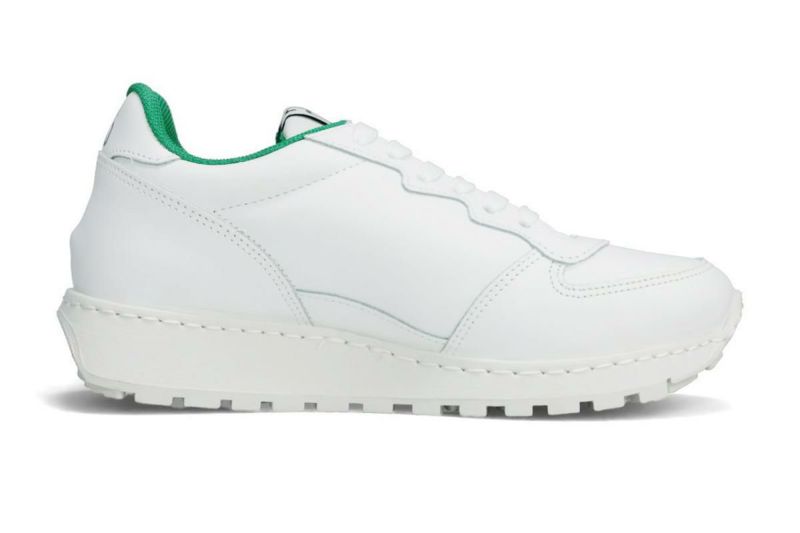 レザースニーカー Leather Sneakers 白を基調としたシンプルなデザインに、履き口のグリーンがアクセントになったスニーカー。 Detail 全体を白で統一したミニマルなデザイン。 側面の星形パンチングは、遊び心のある軽やかな印象を与え、足元を彩ります。 程よいソール厚みが脚を長く見せ、スタイルアップ効果も発揮します。 クッション性に優れた厚底ソールと厚めのインソールが、地面からの衝撃を吸収し足への負担を軽減。 長時間履いても疲れにくく、快適な歩行をサポートします。