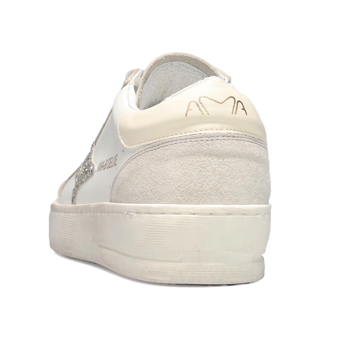 サイドにあしらわれた存在感のあるグリッタースターが、クリーンなホワイトレザーにさりげない華やかさと遊び心を添える一足。