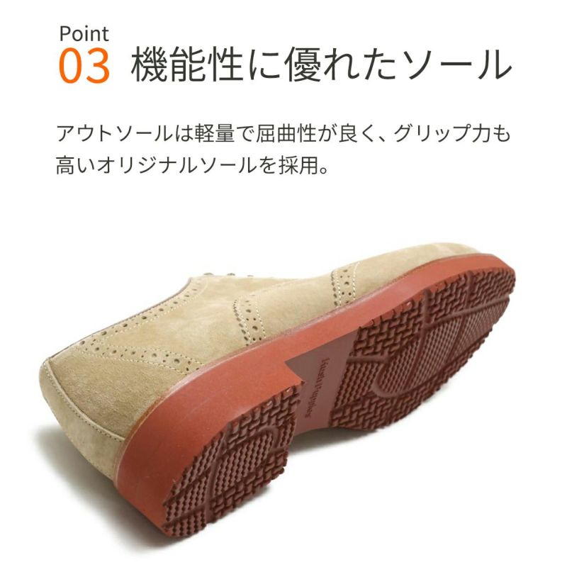 アッパーには、通気性・撥水性に優れた豚革スエードのパピーレザーを使用。優れた通気性と柔らかい足当たりで、長時間履いていても疲れにくい一足。