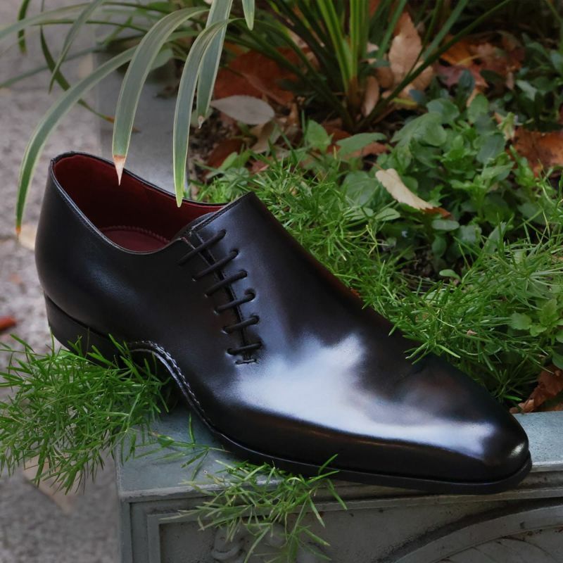 アッパーを一枚革で仕立てたホールカットに、独創的なサイドレースを組み合わせたオックスフォードシューズ。