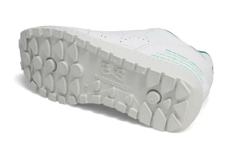 レザースニーカー Leather Sneakers 白を基調としたシンプルなデザインに、履き口のグリーンがアクセントになったスニーカー。 Detail 全体を白で統一したミニマルなデザイン。 側面の星形パンチングは、遊び心のある軽やかな印象を与え、足元を彩ります。 程よいソール厚みが脚を長く見せ、スタイルアップ効果も発揮します。 クッション性に優れた厚底ソールと厚めのインソールが、地面からの衝撃を吸収し足への負担を軽減。 長時間履いても疲れにくく、快適な歩行をサポートします。