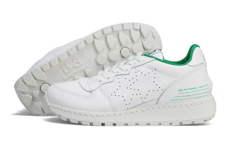 2STAR History 2☆STARはイタリアのマフラ社が手掛けるスニーカーブランド。 シューズファクトリーが多いことで有名なブーリア州バリーで1950年代に創業。 60年以上の長い歴史のなかで培われた技術と、繊細な仕事で作られたスニーカーは、ブランドスタート後、ヨーロッパ全土で10万足以上を販売し、イタリアでも「Luisa via Roma」や「GIO MORRETI」など有名セレクトショップでも展開されています。 Item Information ▼ブランド 2STAR / ツースター Made in Italy / イタリア製 ▼品番 2s210w ▼色 ホワイト/グリーン ▼特徴 全体を白で統一したミニマルなデザイン。 側面の星形パンチングは、遊び心のある軽やかな印象を与え、足元を彩ります。 程よいソール厚みが脚を長く見せ、スタイルアップ効果も発揮します。 クッション性に優れた厚底ソールと厚めのインソールが、地面からの衝撃を吸収し足への負担を軽減。 長時間履いても疲れにくく、快適な歩行をサポートします。 ▼サイズ 35|22.5cm 36|23.0cm 37|23.5cm 38|24.0cm 39|24.5cm ※上記のサイズは当店での参考サイズ目安でございます。ブランドや木型によって表記サイズの寸法は異なります。 ▼素材 アッパー素材 : レザー ソール素材 : ゴム ▼在庫について 当店は、店頭同時販売のため、売り切れの場合がございます。 その際は、当店の都合によりキャンセルとさせて頂きますが、ご了承下さいますよう、お願い致します。 ▼その他 お使いのパソコンのモニターの状況、撮影時の状況により、写真と実際の商品の色合いが多少異なる場合がございます。入荷の際すでにお箱が多少破損したもの、汚れのあるものがございます。 摩擦や水濡れによって衣類に色移りする場合がございます。十分にご注意ください。 こちらの商品は天然素材を使用しておりますため、もともとのシワ、色むら、小さな穴等がある場合がございます。こちらは天然皮革の味であり、風合いでございますので、不良品ではございません。 ▼実店舗との同時運営に伴うご注意点 当店は実店舗との同時運営のため、試着時についた履きジワ等があることがございます。その都度ケアをしておりますが、シワが深い場合はメールにてご連絡させていただくことがございます。その際、基本的には、ご了承をいただいてからの発送とさせていただいております。あしからずご了承くださいませ。