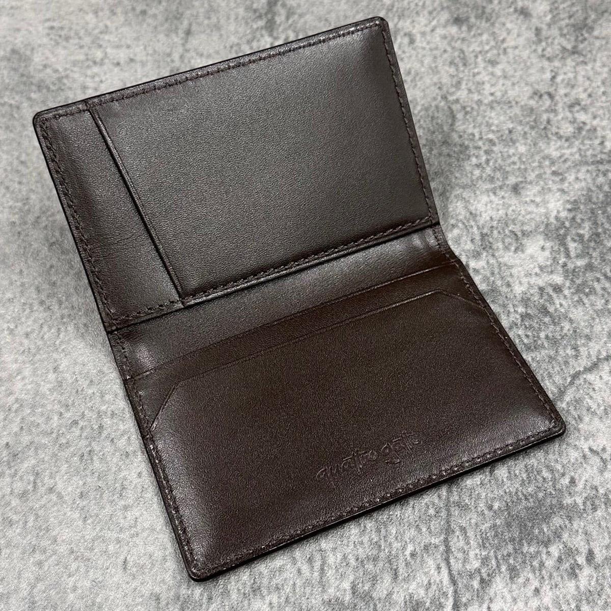 内装には、落ち着いたこげ茶の牛革を使用。薄マチ仕様のスマートなフォルムは、ジャケットの内ポケットやバッグにもすっきりと収まり、持ち運びも快適。