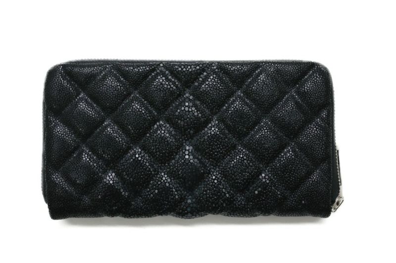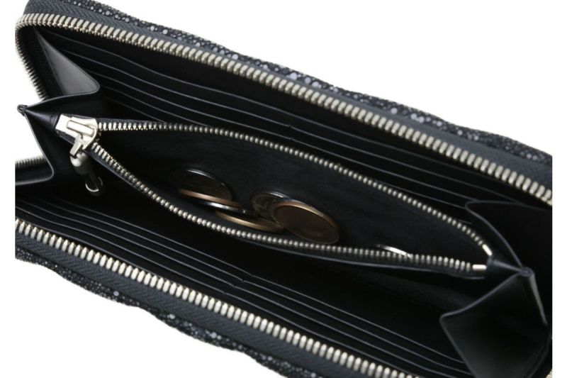 ▼特徴 キャビアのような輝きが美しいノワール(フランス語で「黒」の意)のエイ革「ガルーシャ」を、外装としてセレクトしたラウンドジップ長財布。