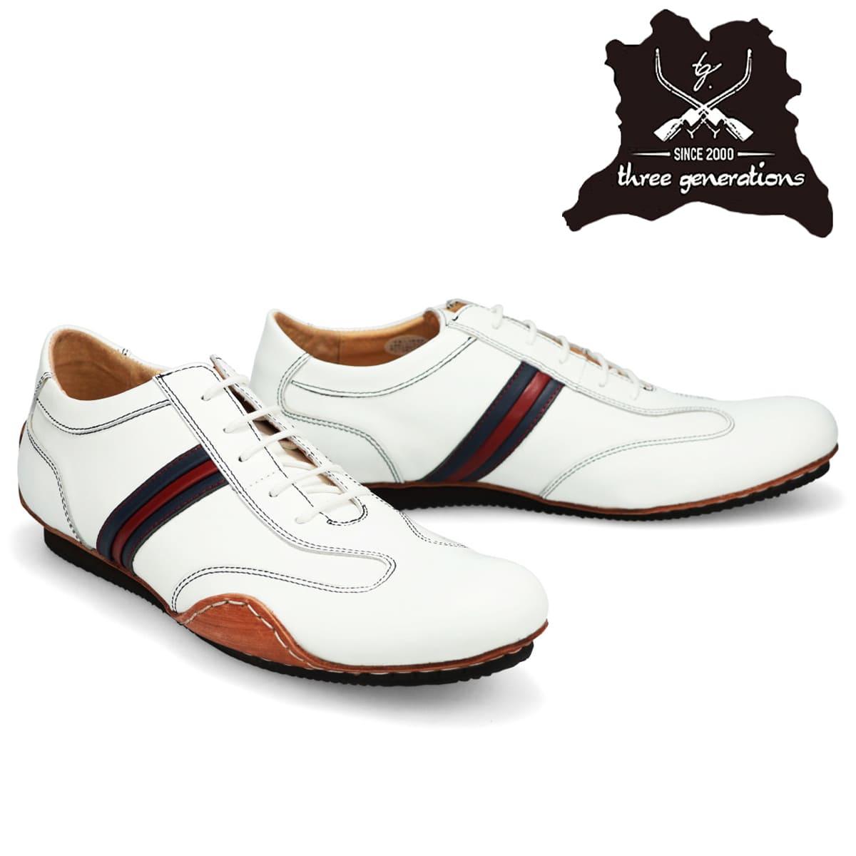 three generations History three generations(スリージェネレーションズ)は、ヨーロッパの伝統と革新を融合し、「足元から輝く大人の男」をテーマに紳士靴を生み出すブランドです。特に個性を際立たせるカジュアルシューズを中心に展開し、デザイン性だけでなく、靴一足一足に込められたストーリーが魅力。選ぶ人の人生に寄り添い、その日のスタイルを足元から完成させる、唯一無二の存在を目指しています。 Item Information ▼ブランド three generations / スリージェネレーションズ ▼品番 0410 ▼色 ブラック ブラウン レッド ホワイト/ネイビー ▼特徴 ノーズが少し長めのスマートなシルエットが特徴。 履くことでトゥがやや上がり、美しいフォームを実現。 アッパーのエレガントさと手縫いのステッチ、天然皮革の風合いが絶妙に組み合わさりカジュアルな雰囲気を醸し出しています。 焦がし加工が施され、アンティークな風合いが魅力的。 さらに、2色の革を重ねたサイドラインがデザインのアクセントとなっています。 ※環境によって商品画像のお色に実際の商品と違いがある場合もございます。また、革は天然素材ですので色ムラ、シワの度合いや表情は1足ずつ異なります。 ▼サイズ 39|24.5~25.0cm 40|25.0~25.5cm 41|25.5~26.0cm 42|26.0~26.5cm 43|26.5~27.0cm 44|27.0~27.5cm ※上記のサイズは当店での参考サイズ目安でございます。ブランドや木型によって表記サイズの寸法は異なります。 ▼素材 アッパー素材 : 牛革/豚革 ソール素材 : ゴム底 ▼在庫について 当店は、店頭同時販売のため、売り切れの場合がございます。 その際は、当店の都合によりキャンセルとさせて頂きますが、ご了承下さいますよう、お願い致します。 ▼その他 お使いのパソコンのモニターの状況、撮影時の状況により、写真と実際の商品の色合いが多少異なる場合がございます。入荷の際すでにお箱が多少破損したもの、汚れのあるものがございます。 摩擦や水濡れによって衣類に色移りする場合がございます。十分にご注意ください。 こちらの商品は天然素材を使用しておりますため、もともとのシワ、色むら、小さな穴等がある場合がございます。こちらは天然皮革の味であり、風合いでございますので、不良品ではございません。 ▼実店舗との同時運営に伴うご注意点 当店は実店舗との同時運営のため、試着時についた履きジワ等があることがございます。その都度ケアをしておりますが、シワが深い場合はメールにてご連絡させていただくことがございます。その際、基本的には、ご了承をいただいてからの発送とさせていただいております。あしからずご了承くださいませ。