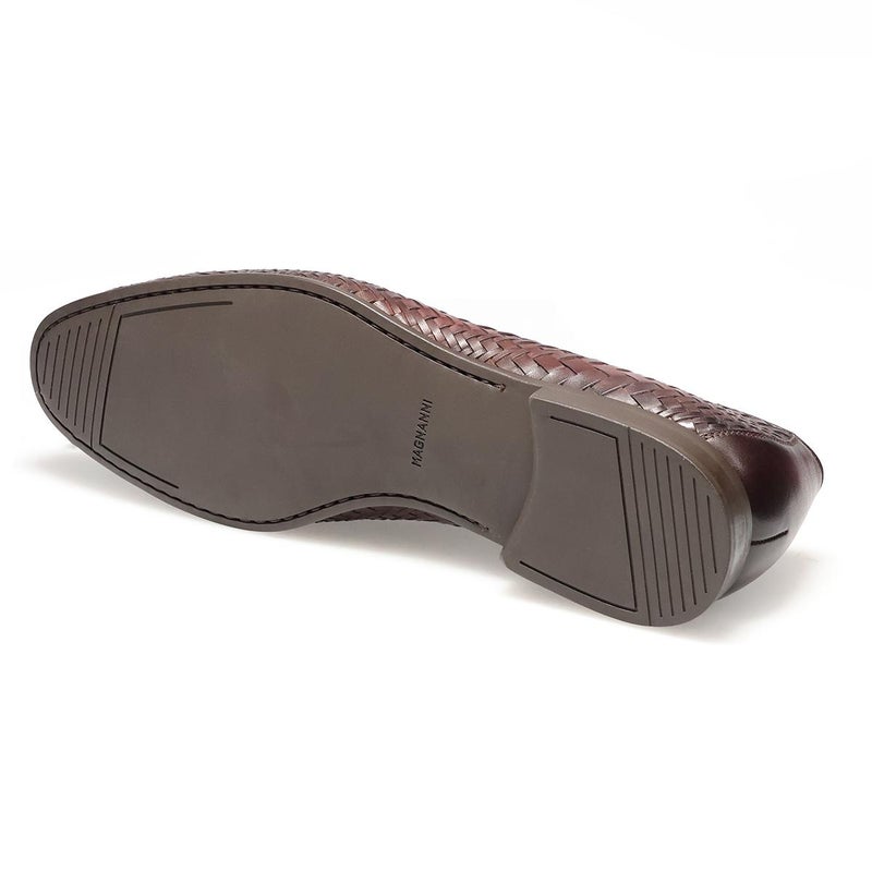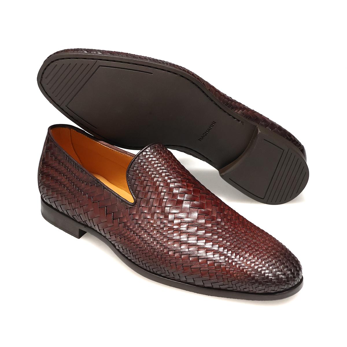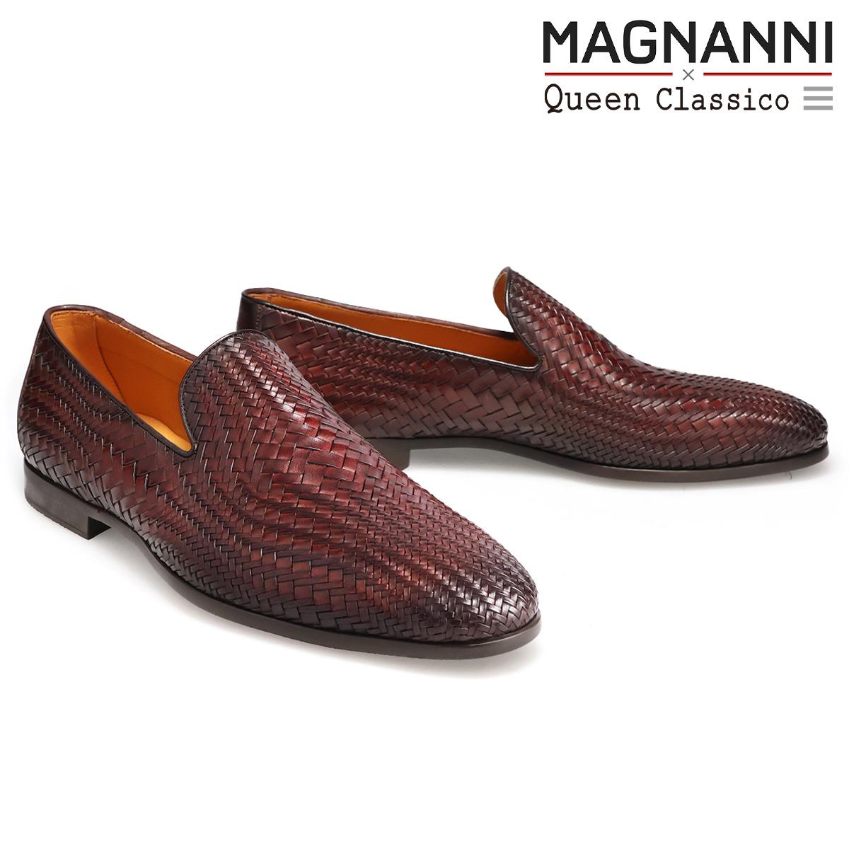 名門マグナーニの誇る職人技によるレザーのイントレチャート(手編み込み)が印象的なローファー。アッパー全体に施された立体的な織り模様は、落ち着きのある品格と、足元から存在感を演出します。