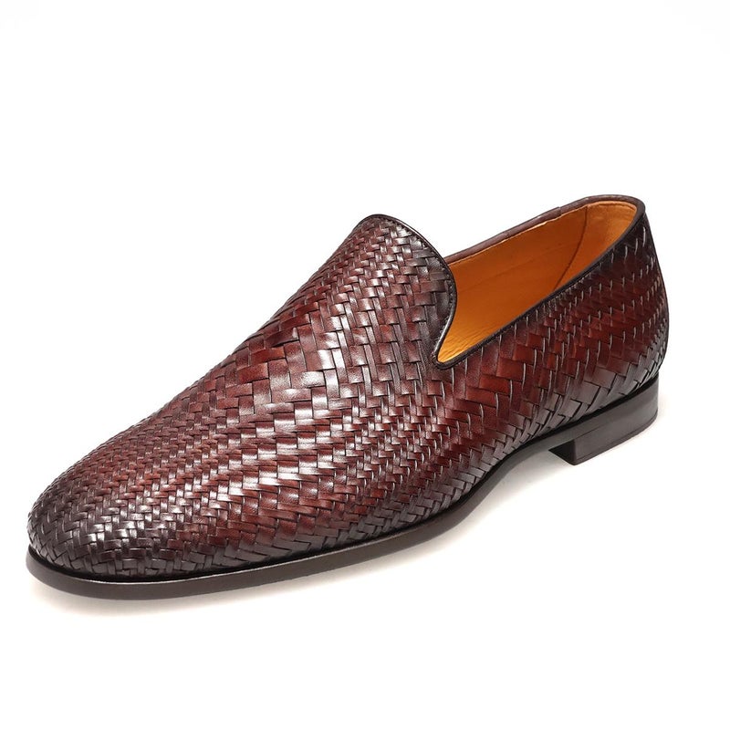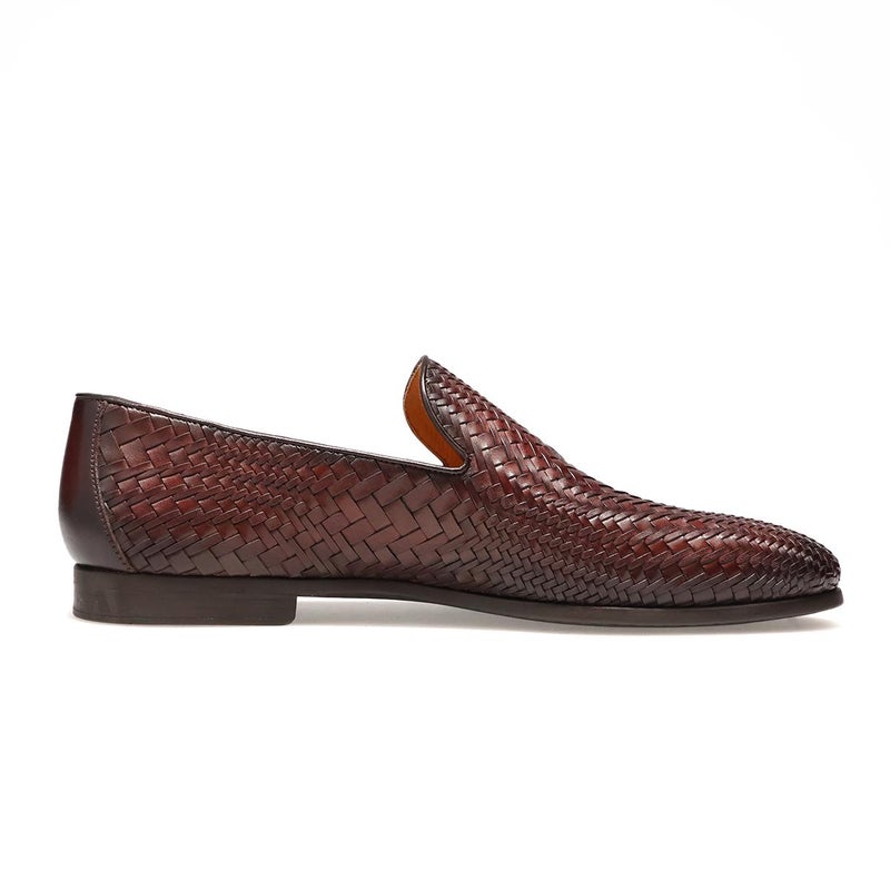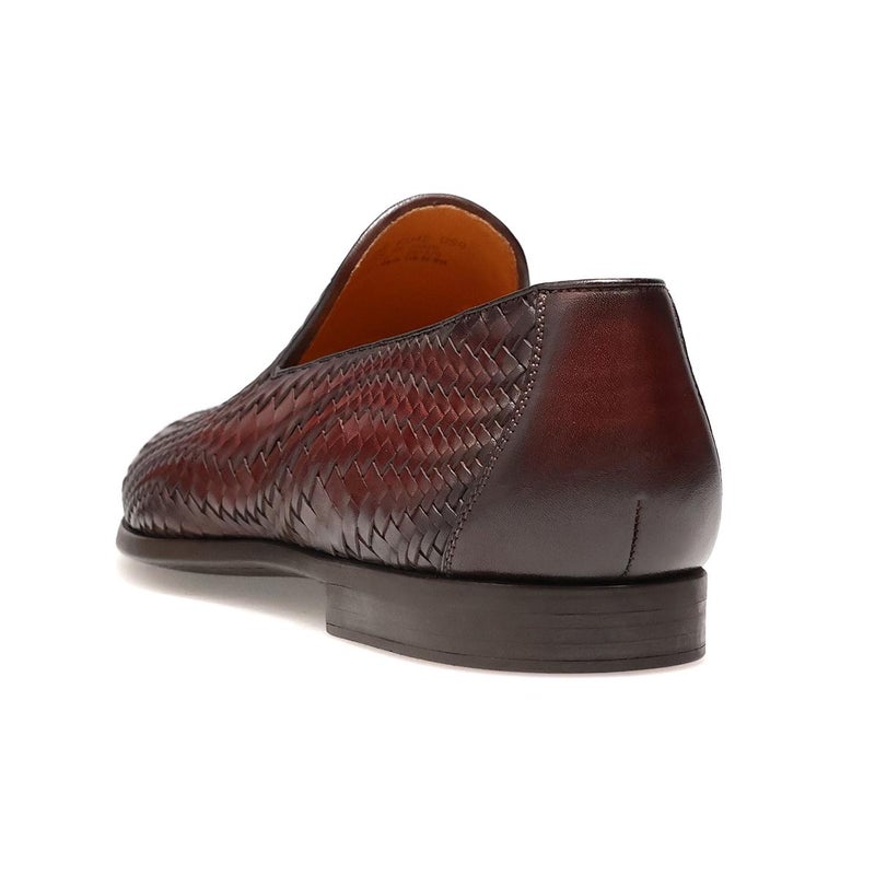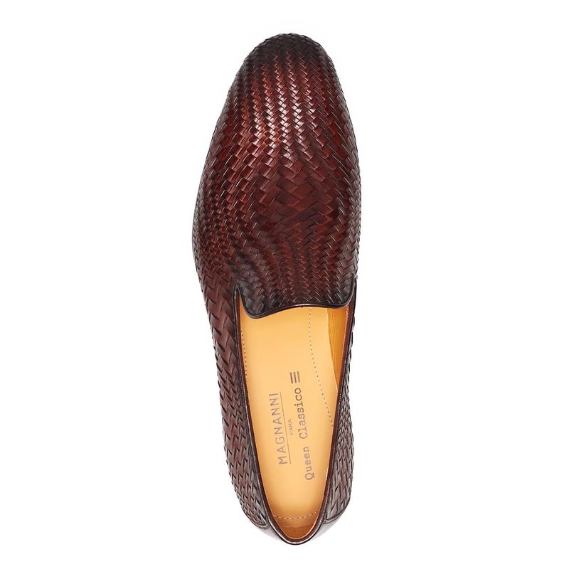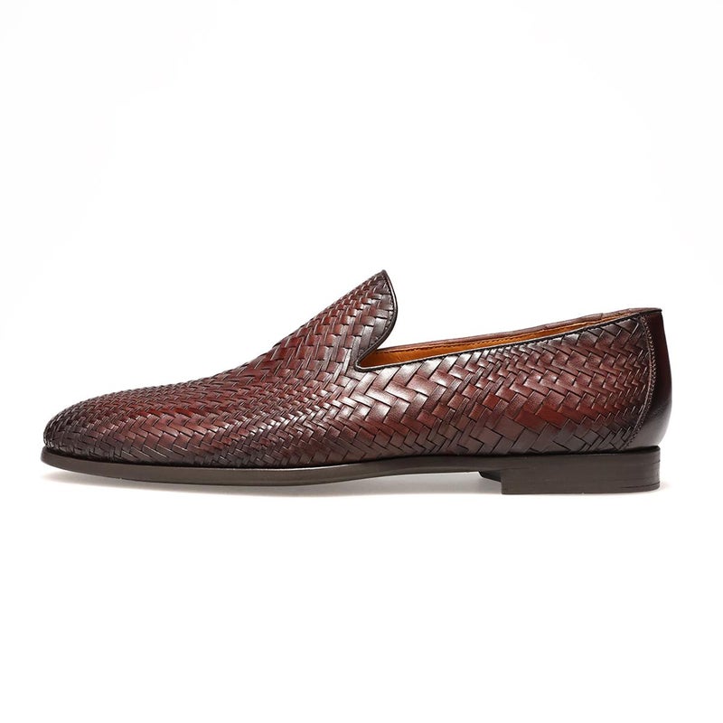 名門マグナーニの誇る職人技によるレザーのイントレチャート(手編み込み)が印象的なローファー。アッパー全体に施された立体的な織り模様は、落ち着きのある品格と、足元から存在感を演出します。