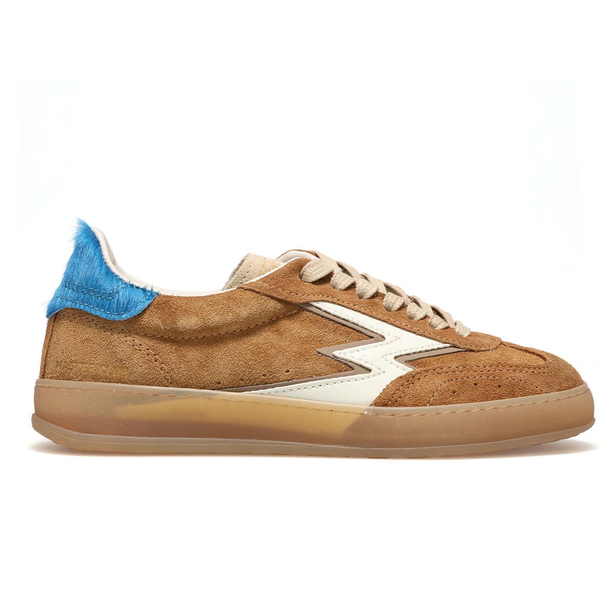 落ち着いたタバコカラーのスエードに、ホワイトレザーのロゴがアクセントとなり、上品な印象を演出。