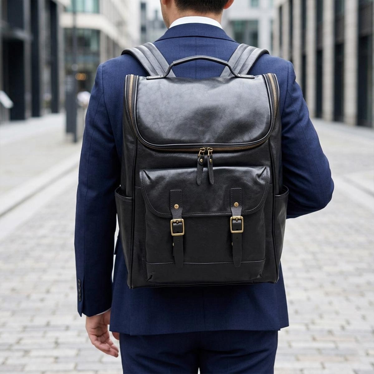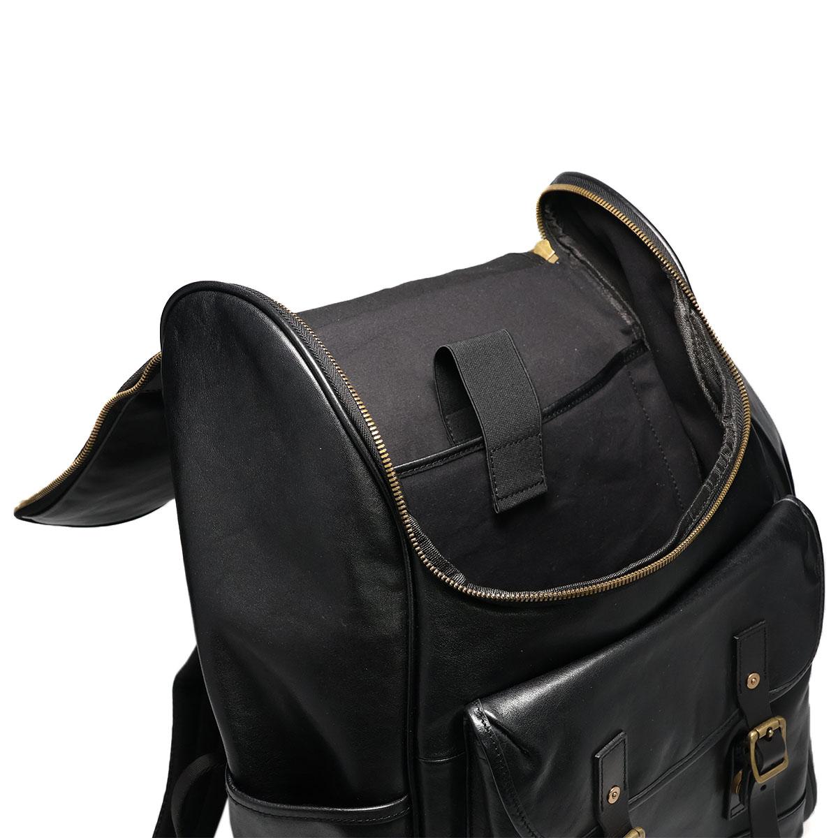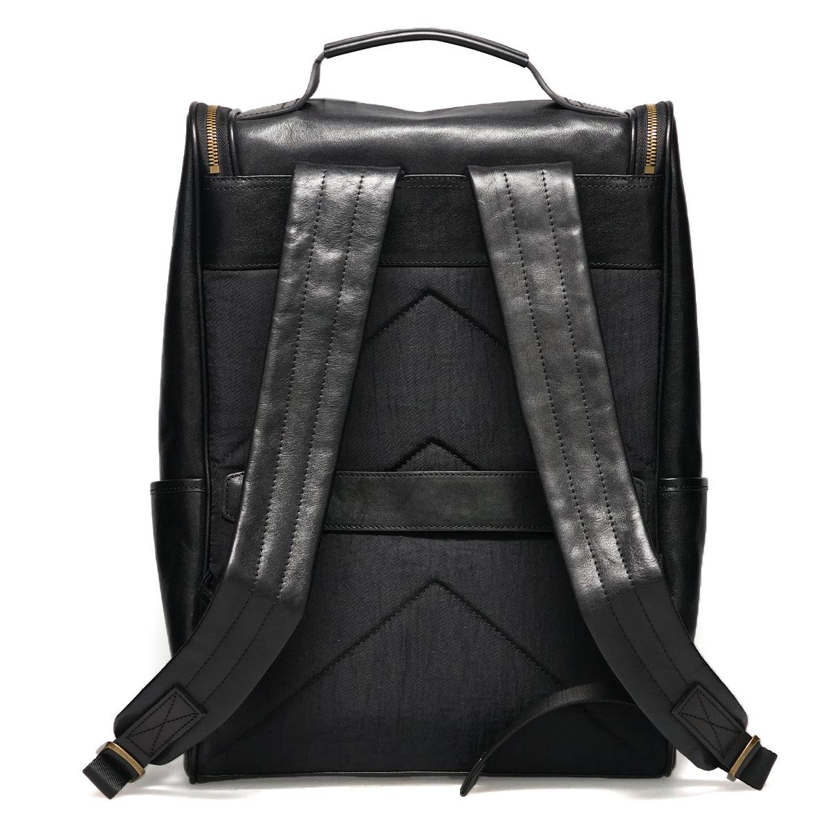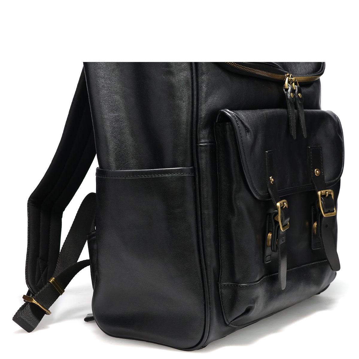 ブラックのワントーンにアンティークゴールドのバックルが映える、クラシカルなバックパック。