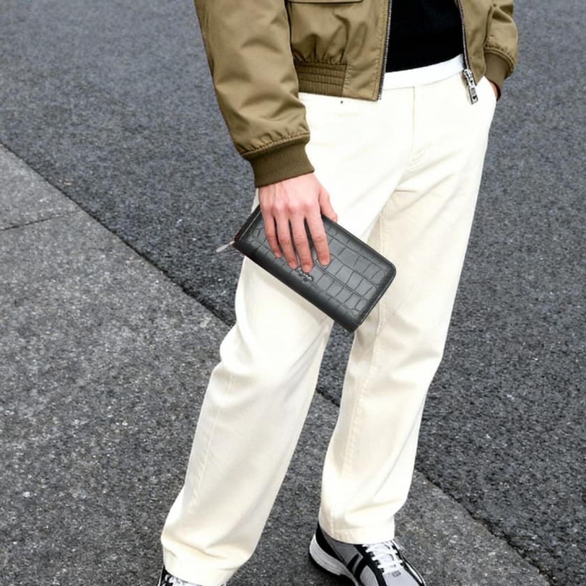ひと目で違いがわかる美しいステッチワーク、クロコ型押しの魅力を引き立てる張りのある仕立て、そして手に吸い付くような上質な触り心地。